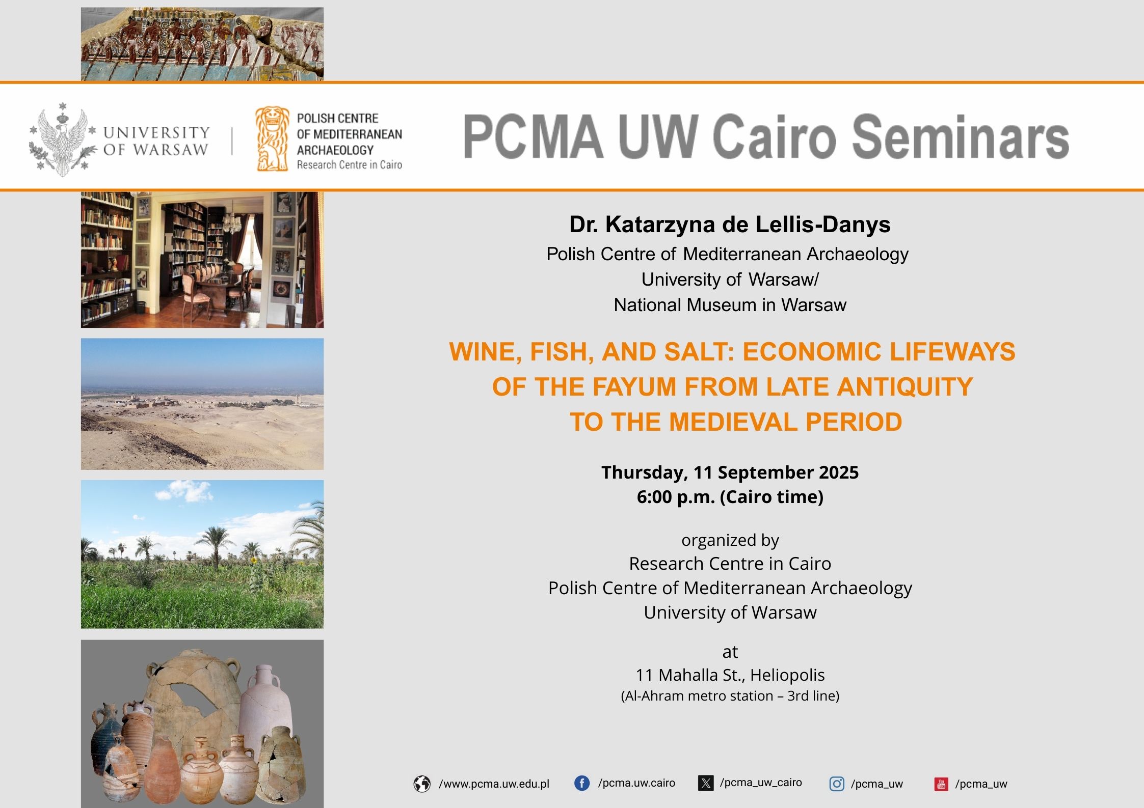 We wrześniu startuje nowy cykl wykładów – PCMA UW Cairo Seminars, organizowany w Stacji Badawczej w Kairze CAŚ UW. Jako pierwsza wystąpi dr Katarzyna de Lellis-Danys (CAŚ UW, MNW) z prezentacją: „Wine, Fish, and Salt: Economic Lifeways of the Fayum from Late Antiquity to the Medieval Period”.