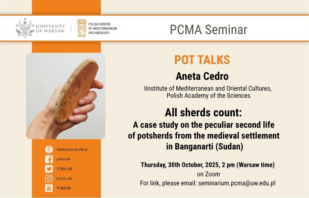 Na najbliższym Seminarium PCMA wystąpi Aneta Cedro (Instytut Kultur Śródziemnomorskich i Orientalnych Polskiej Akademii Nauk) z prezentacją: „All sherds count: A case study on the peculiar second life of potsherds from the medieval settlement in Banganarti (Sudan)”.